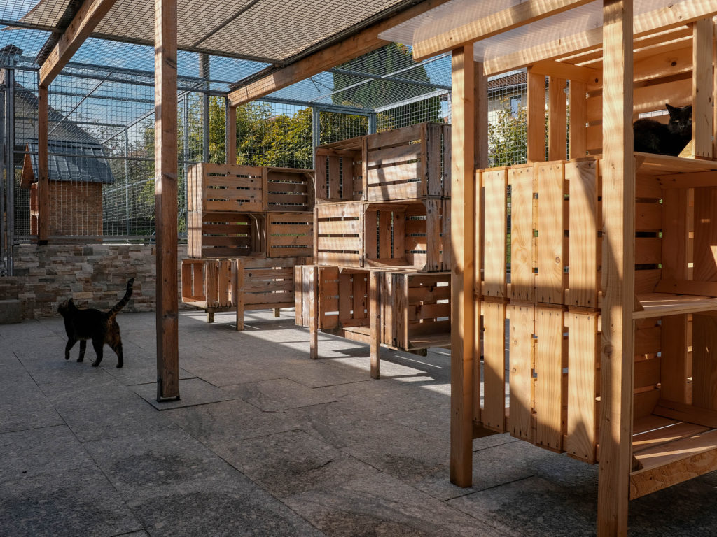 The outdoor enclosures are fenced, providing a secure space for cats to explore and play outdoors.